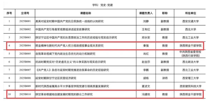 10月,陕西照金干部学院2项课题《照金精神与新时代共产党人权力观政绩观事业观关系研究》《陕甘革命根据地创建发展时期党的群众工作研究》获批2025年陕西省社会科学基金年度项目立项。