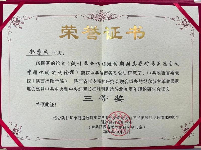 10月,陕西照金干部学院青年教师郝雯杰撰写的《陕甘革命根据地时期刘志丹对马克思主义中国化的实践诠释》论文,在“纪念陕甘革命根据地创建暨中共中央和中央红军长征胜利到达陕北90周年理论研讨会”中荣获三等奖并收录于优秀论文集。